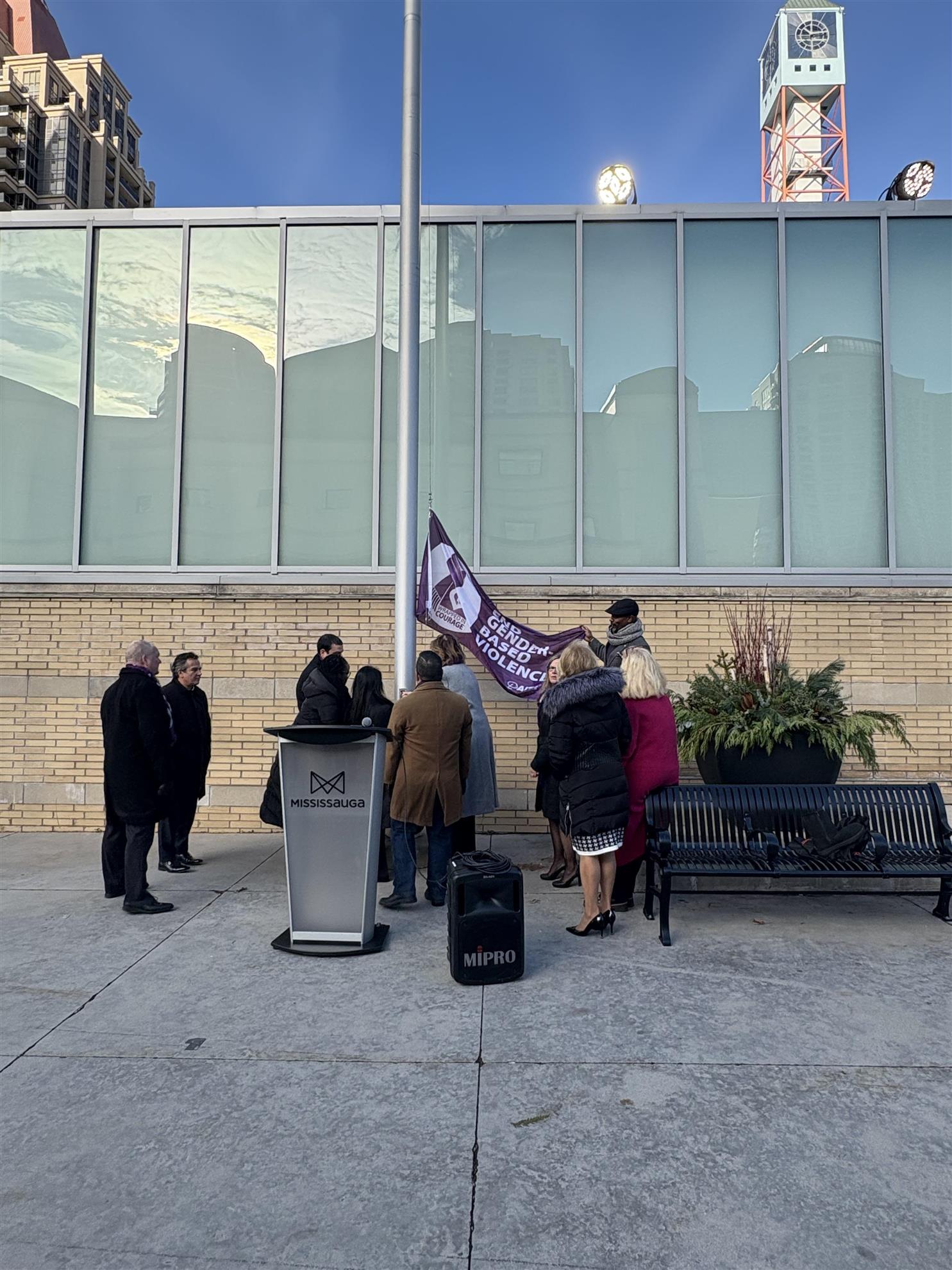 On Monday November 24th the Rotary Club of Mississauga, Peace and Environment Committee Lorraine Crow stood in solidarity with Mayor Carolyn Parrish, City Councillors, charities Armagh House and Embrave: Agency to End Violence, staff and survivors to raise a flag with mark the first day of a 16 international campaign to End Gender-based Violence.